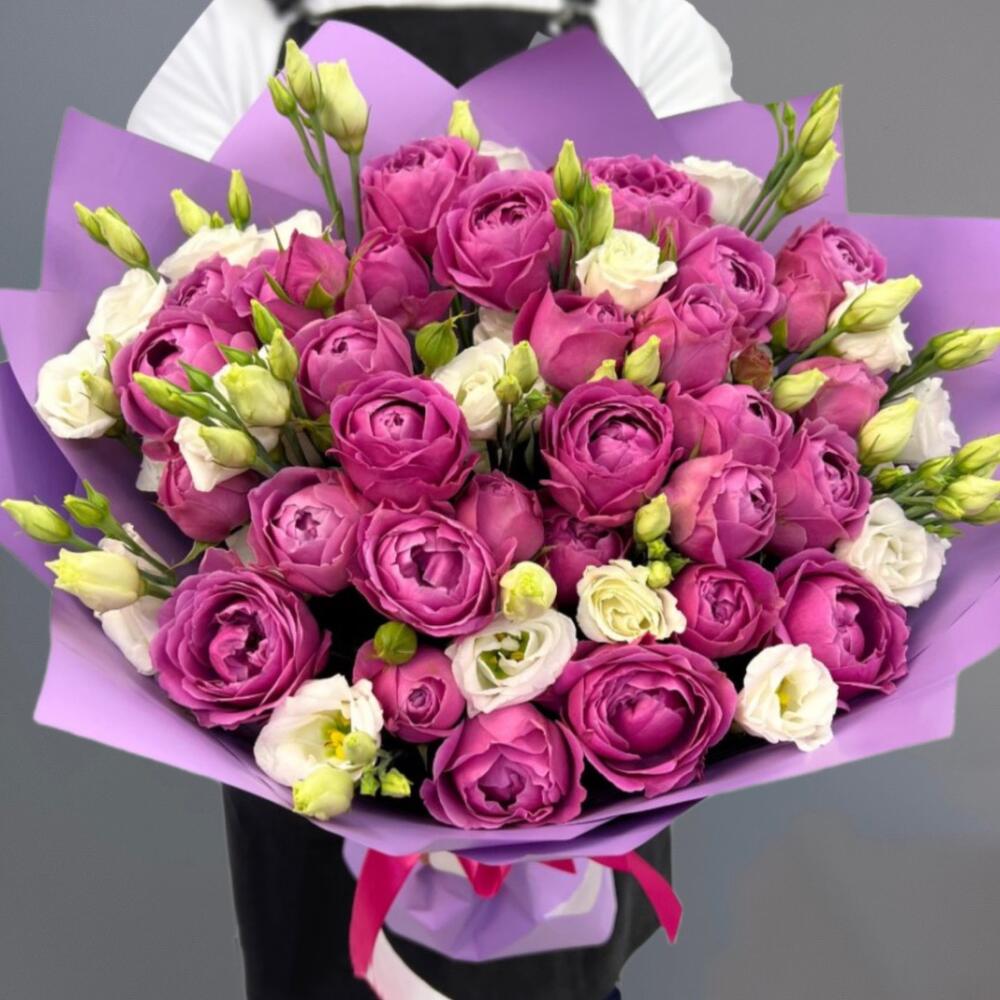 Букет из пионовидных роз Misty Bubbles и белой эустомы в красивой дизайнерской упаковке