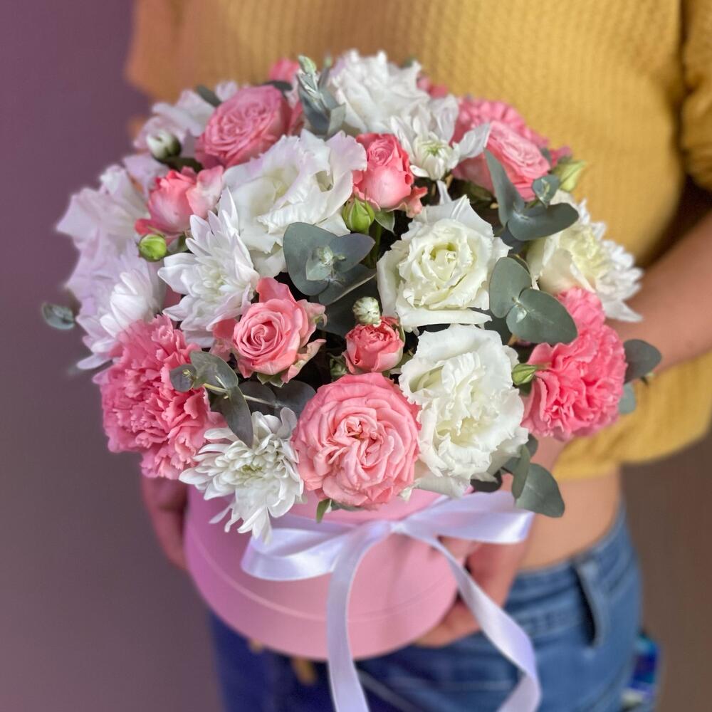 Хризантема кустовая - 1 шт. Эвкалипт - 2 шт. Эустома - 3 шт. Лента атласная - 1 шт. Диантус - 3 шт. Коробка шляпная - 1 шт. Роза кустовая пионовидная - 3 шт. Оазис флористический - 1 шт.